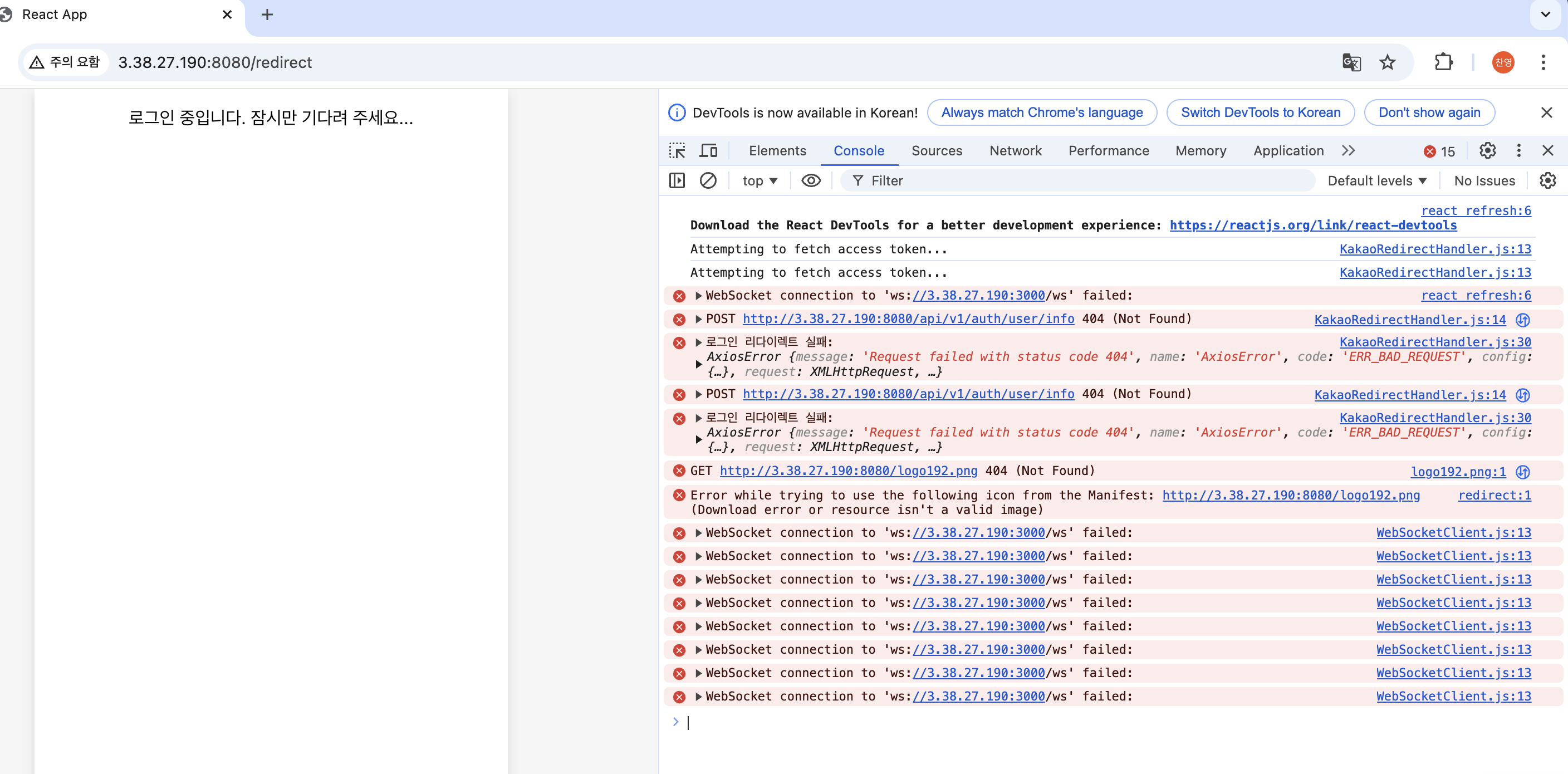이러한 구조에서 Nginx 리버스 프록시를 통한 카카오 소셜 로그인(OAuth2&JWT) 구현 과정에서 여러 기술적 이슈들이 있었습니다. 구체적으로는 Proxy 설정 오류,Redirect URI 불일치, Cookie 전달 이슈, 소켓 문제 등 다양한 에러가 발생했는데요.