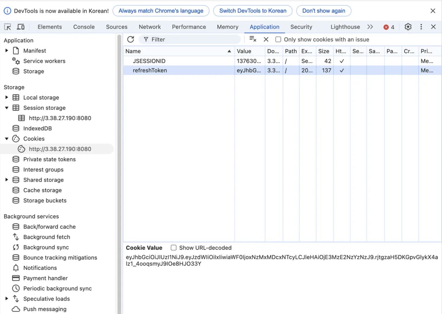 localhost 환경에서 HTTP 통신을 통해 백엔드에서 생성한 Refresh Token이 Cookie에 잘 담겨 클라이언트로 전달되는 것을 확인하고, 배포된 환경에서 Nginx 리버스 프록시로 가 잘 전달이 되는지 테스트를 해보았습니다.