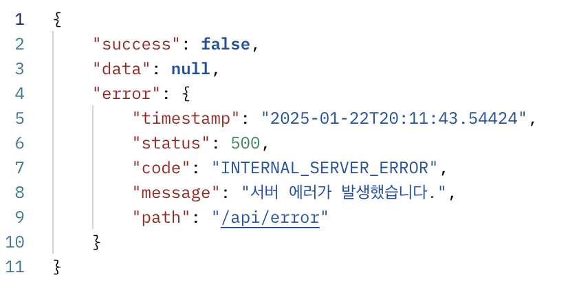 예외 처리 응답의 경우, error를 통해 예외 상황에 대한 설명을 제공하고, 요청 값 중 잘못된 부분을 구체적으로 명시합니다. 이때 success는 false로 설정되며, data는 null 값을 가집니다.