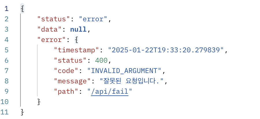 예외 처리 응답의 경우, error를 통해 예외 상황에 대한 설명을 제공하고, 요청 값 중 잘못된 부분을 구체적으로 명시합니다. 이때 success는 false로 설정되며, data는 null 값을 가집니다.