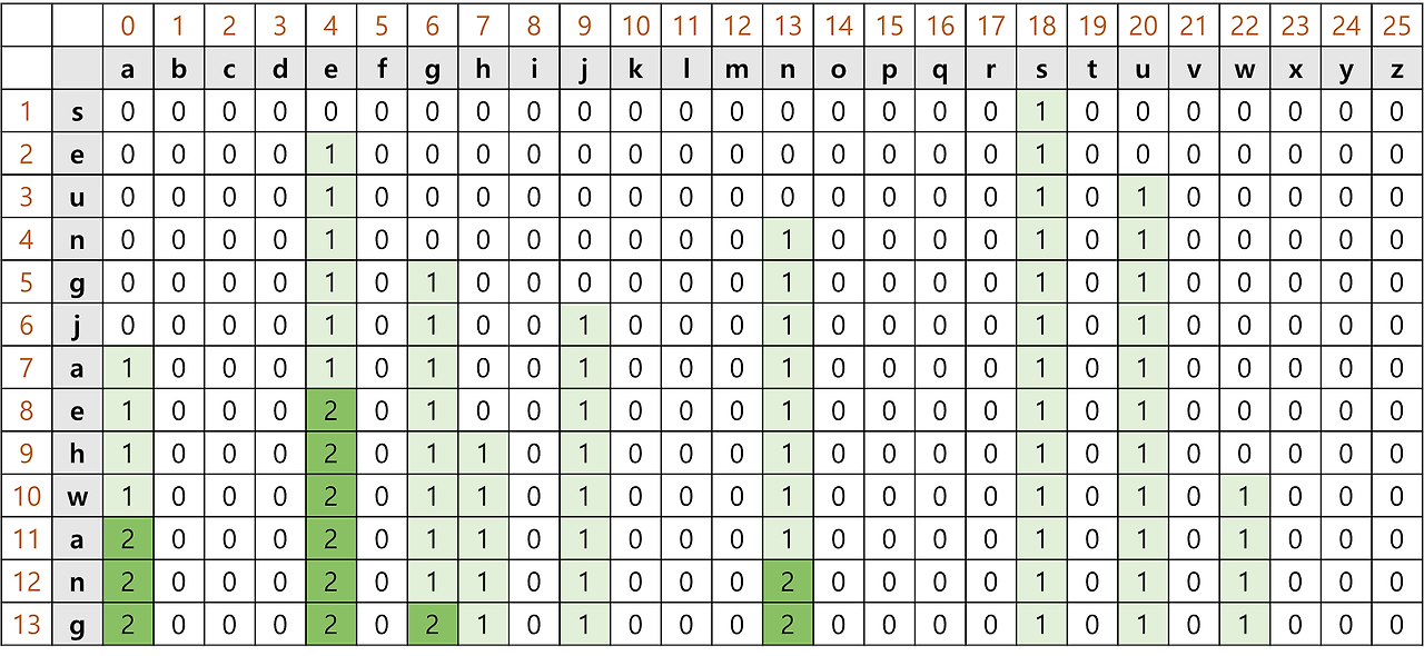 누적합 구현을 구체적으로 설명하자면, 주어진 문자열과 알파벳 데이터를 기반으로 2차원 배열을 생성하고, 문자열을 순회하며 각 알파벳이 포함되었는지를 확인해 누적합 방식으로 값을 저장합니다.