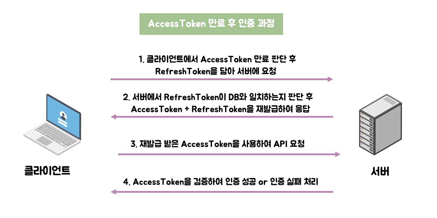 1. 클라이언트에서 자체적으로 Access Token 만료를 판단 후, 서버에 Refresh Token만을 담아 요청합니다. 2. 서버에서 요청받은 Refresh Token이 DB에 저장된 Refresh Token과 일치하는지 판단 후, 일치하다면 AccessToken과 RefreshToken을 재발급하여 Response에 담아 보냅니다. 이때, 재발급한 RefreshToken으로 DB의 RefreshToken을 업데이트합니다. (RTR 방식) 3. 클라이언트는 서버로부터 재발급받은 Access Token을 요청에 담아 API 요청을 보냅니다. 4. 서버에서 요청받은 Access Token을 검증하여 인증 성공/인증 실패 처리를 합니다.